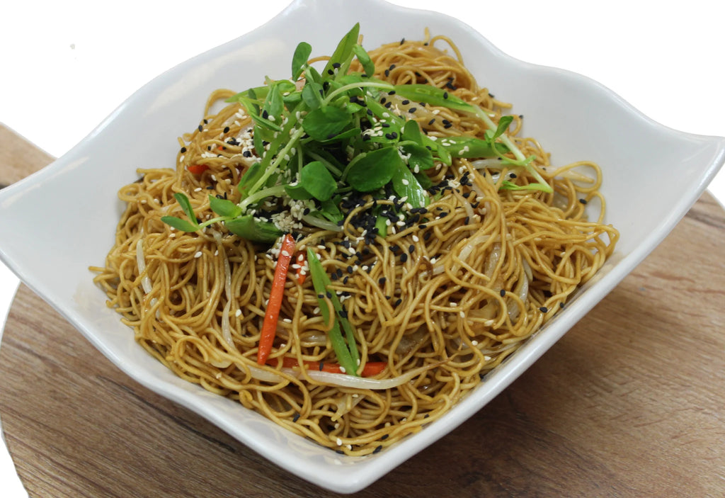 Traditional Asian dish made with egg noodles, carrots, sweet peppers and onions.