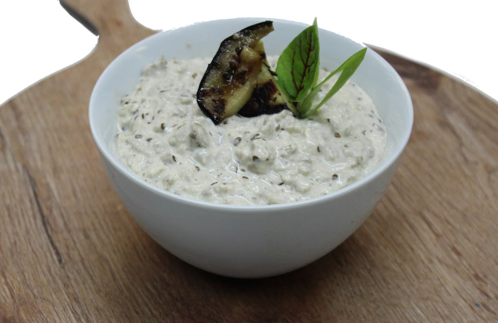 Traditional baba ghanoush dip of cooked eggplant with garlic and lemon.